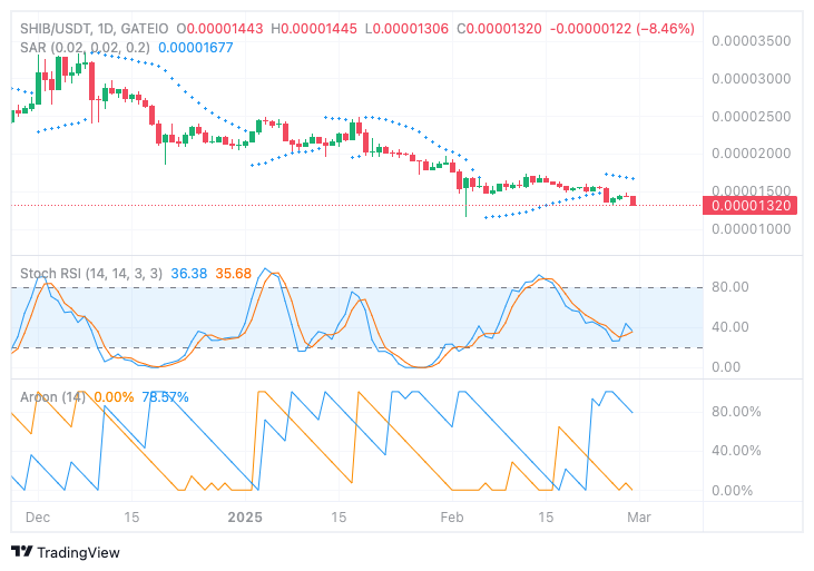 Technical indicators reinforce SHIB’s bearish sentiment. The Parabolic SAR shows downward pressure, with its dots above the price, signaling continued weakness.