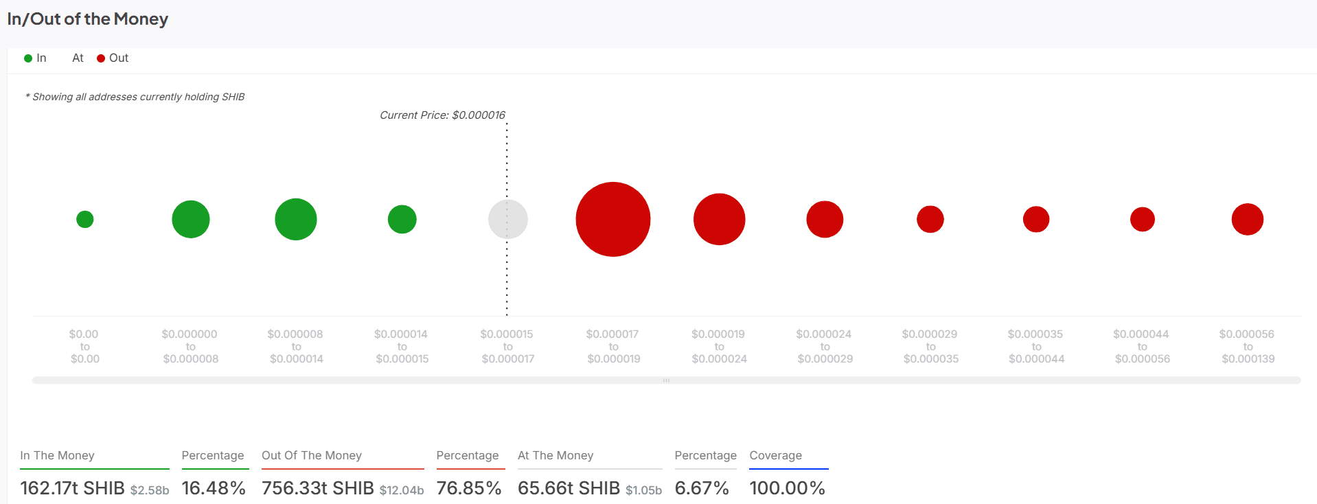 On-chain data revealed that 76.85% of SHIB holders are out of money, meaning they are holding at a loss. Only 16.48% of addresses are in profit, while 6.67% are at breakeven.