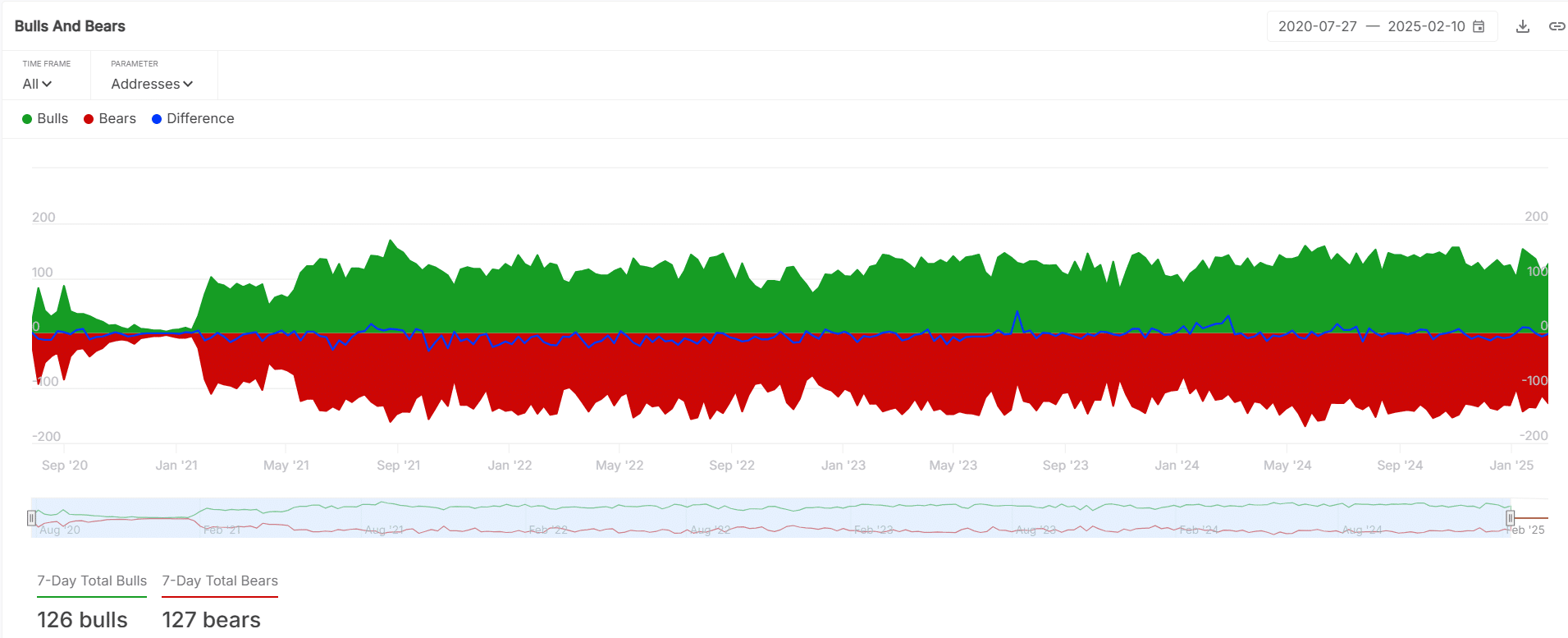 The market remains in a tug-of-war between bulls and bears, with 126 bulls and 127 bears over the past seven days. This near-equal balance reflects uncertainty, but the recent burn rate surge could tip the scale in favor of buyers.