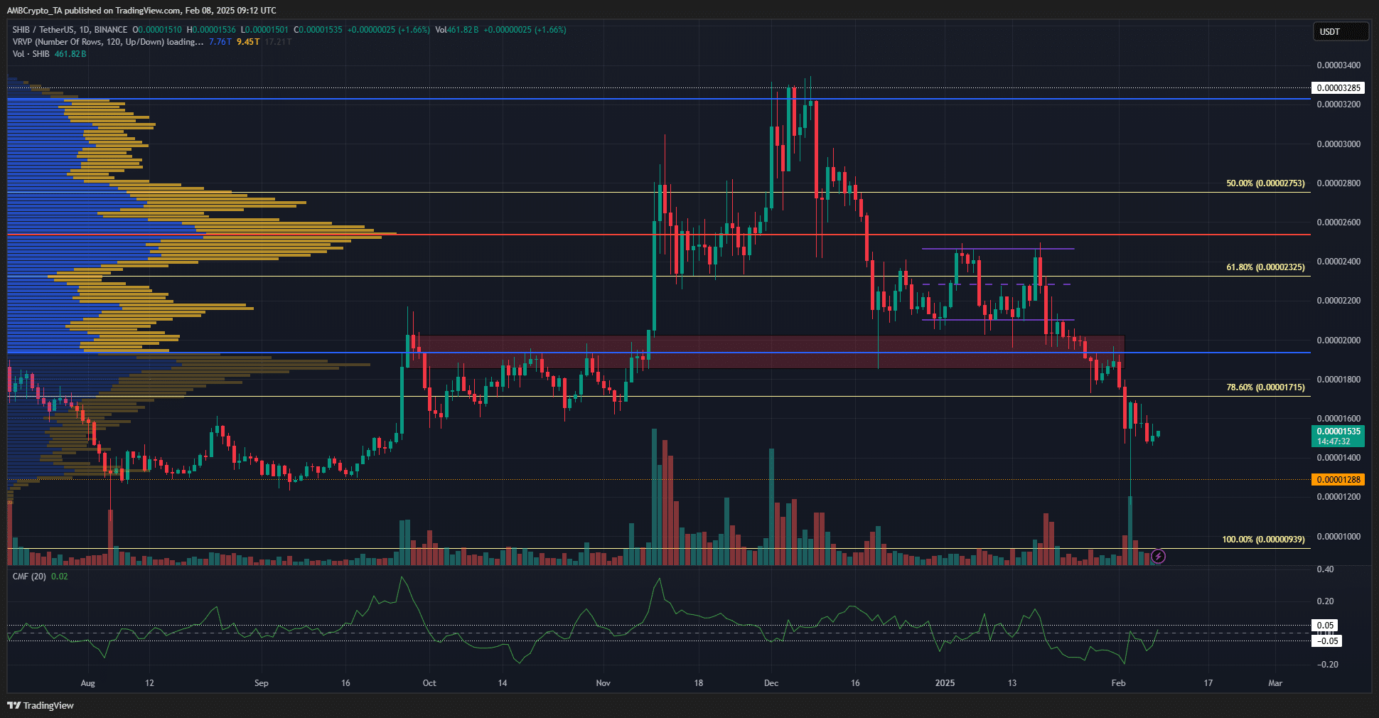 The Visible Range Volume Profile also highlighted the importance of the $0.00002-zone, forming the lower bound of the value area.