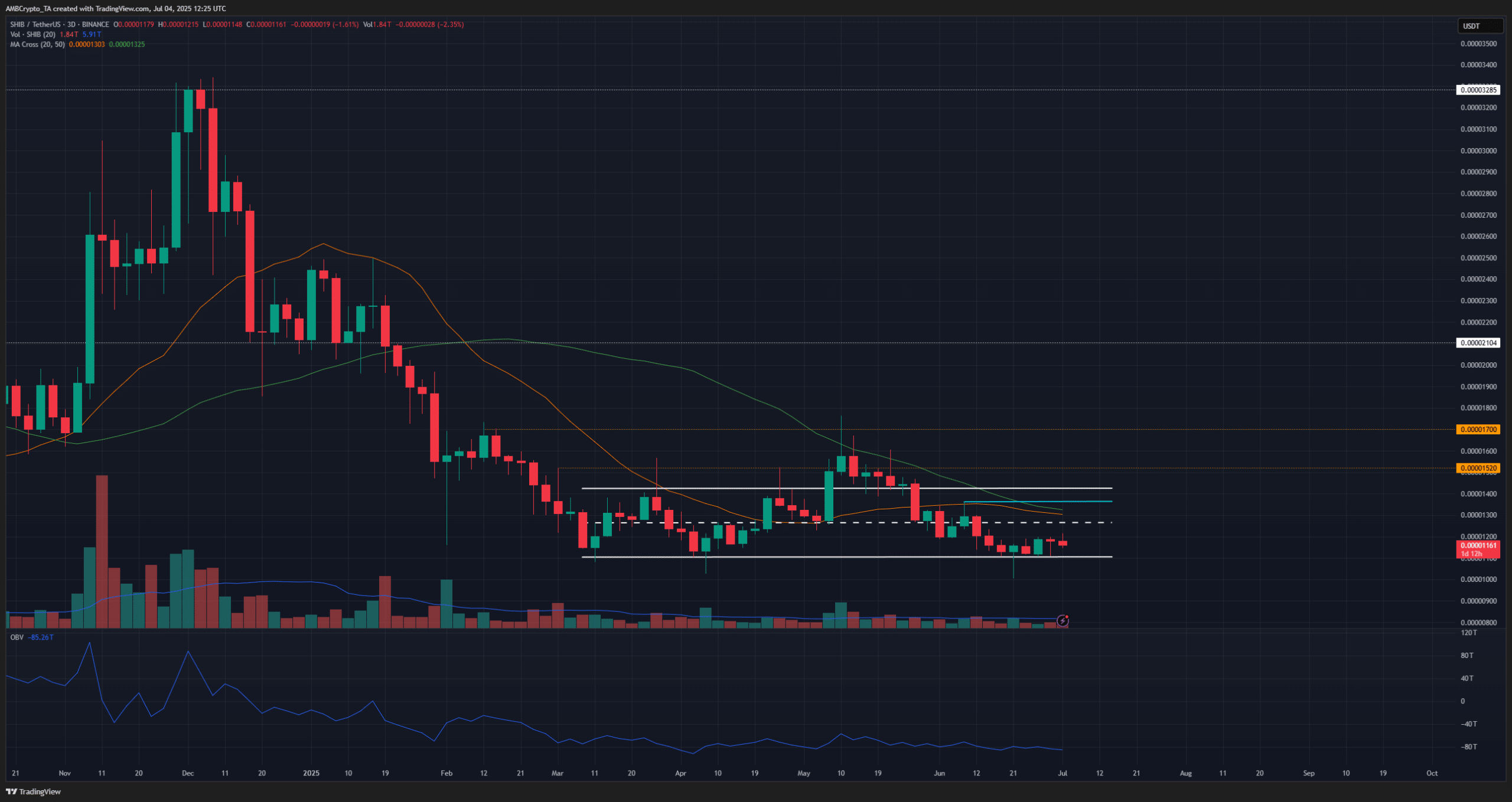 A breakout above $0.0000136 would be the first signal of a recovery.
