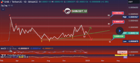According to the analysis, two significant resistance levels are important in SHIB’s path to the upside. The first is at $0.00003239 and represents an immediate hurdle that could attract sellers or trigger profit-taking. This is more revealing, considering it acted as resistance in December 2024. A decisive move above this level would signal bullish momentum.