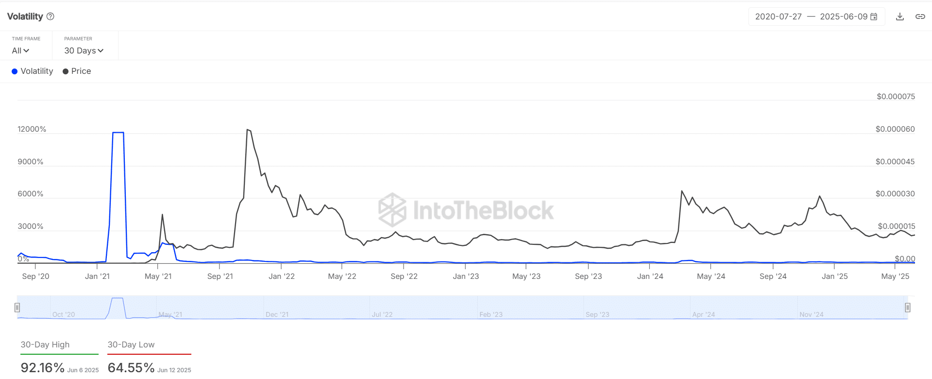 SHIB volatility has dropped to 64.55%, its lowest reading in the past thirty days. This kind of compression typically precedes sharp directional moves as the price coils within a tight range.