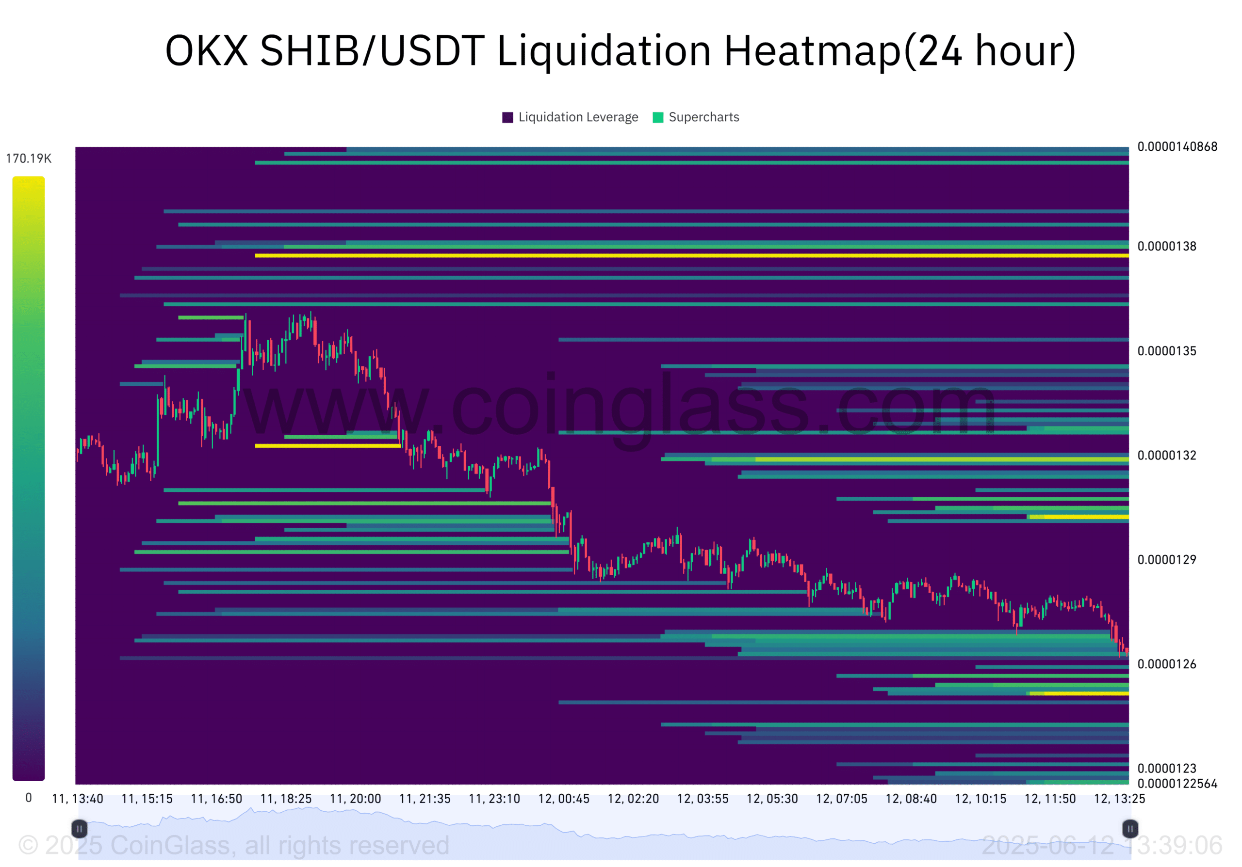 The OKX SHIB/USDT liquidation heatmap reveals dense short liquidation zones between $0.0000132 and $0.0000140. These clusters represent high-leverage traders vulnerable to forced exits.