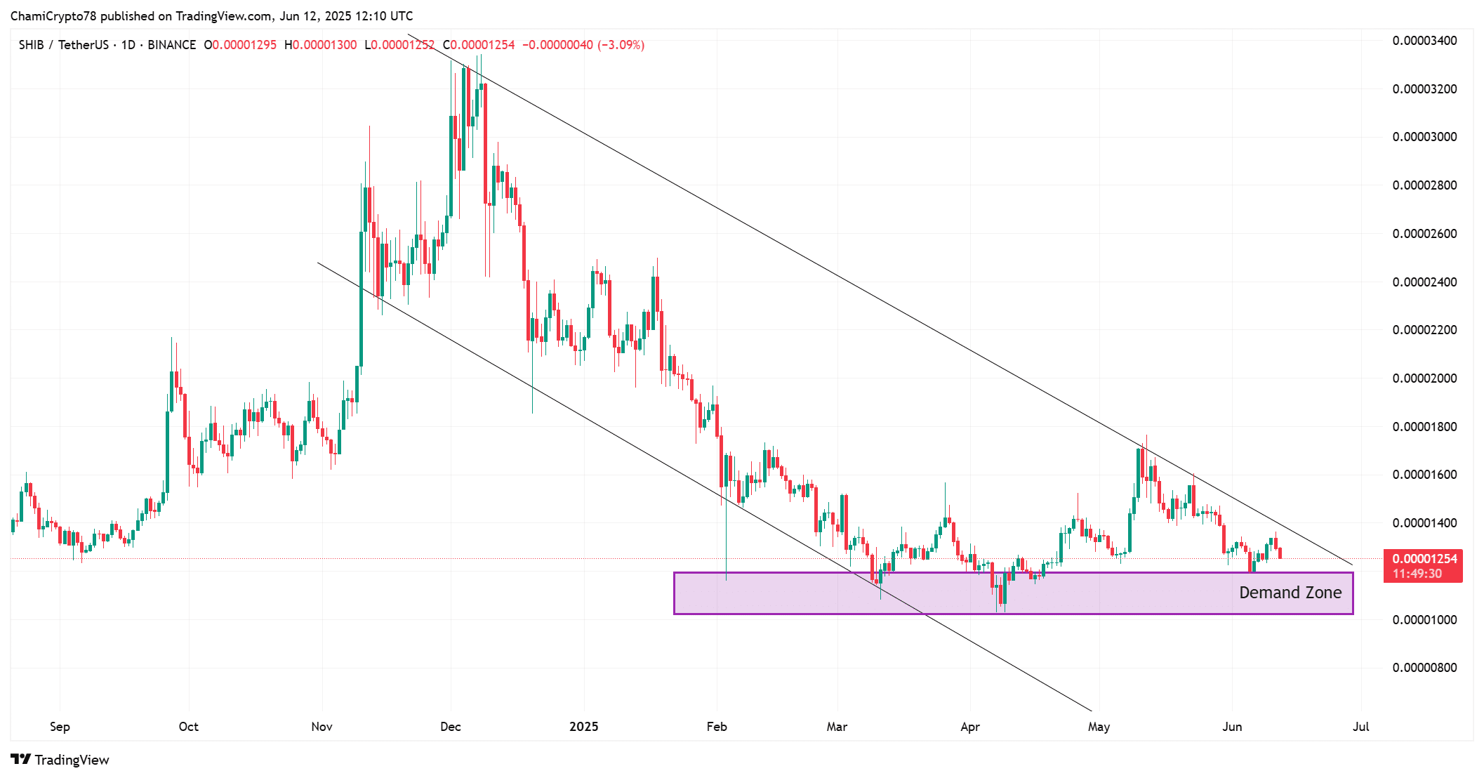 SHIB continues to trade within a persistent descending channel structure. However, the token recently bounced from a clearly defined demand zone between $0.0000100 and $0.0000120, suggesting the presence of strong buyer interest.
