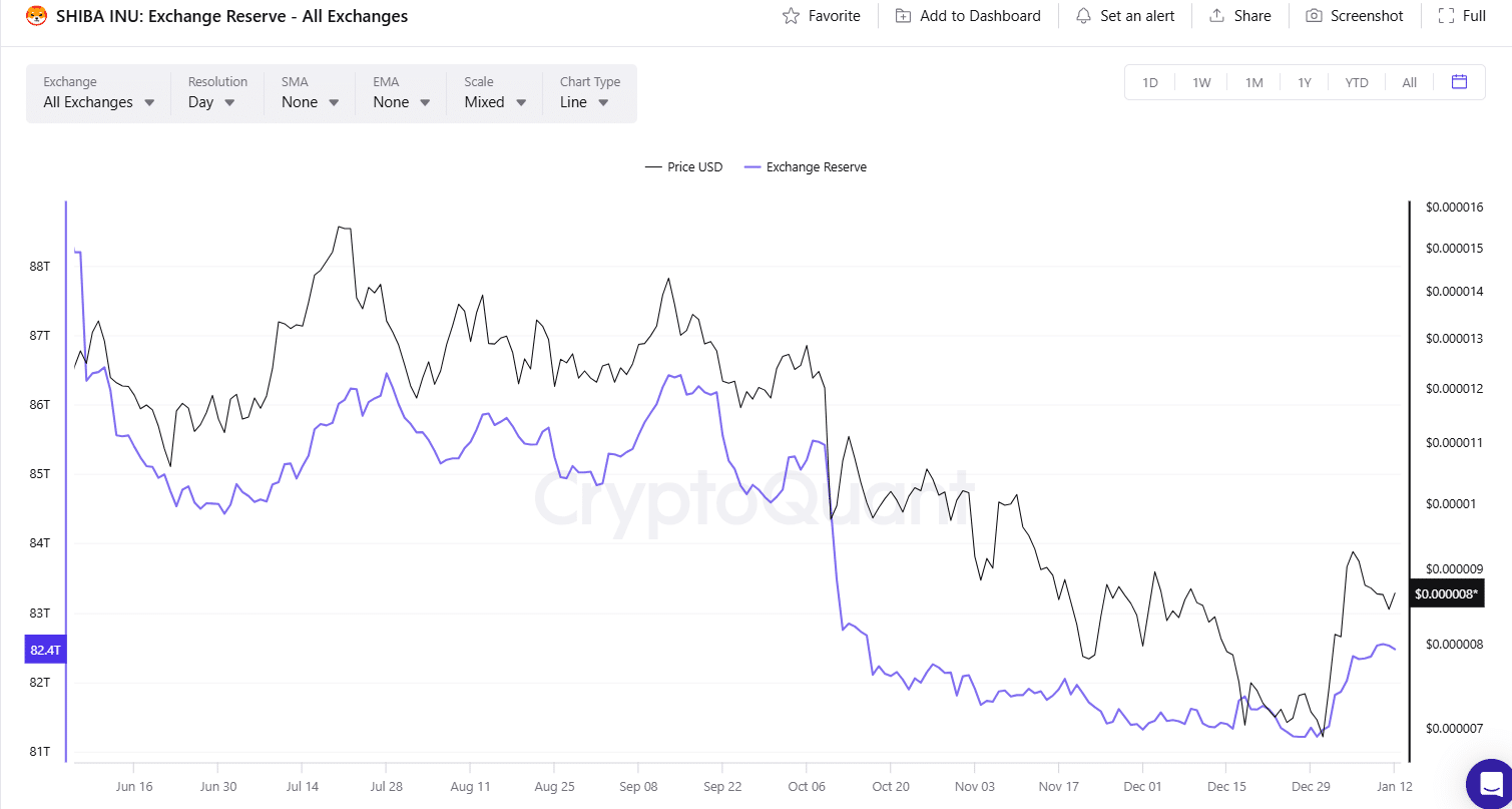 According to CryptoQuant’s Exchange Reserve data, SHIB’s on-exchange supply declined sharply over recent months.