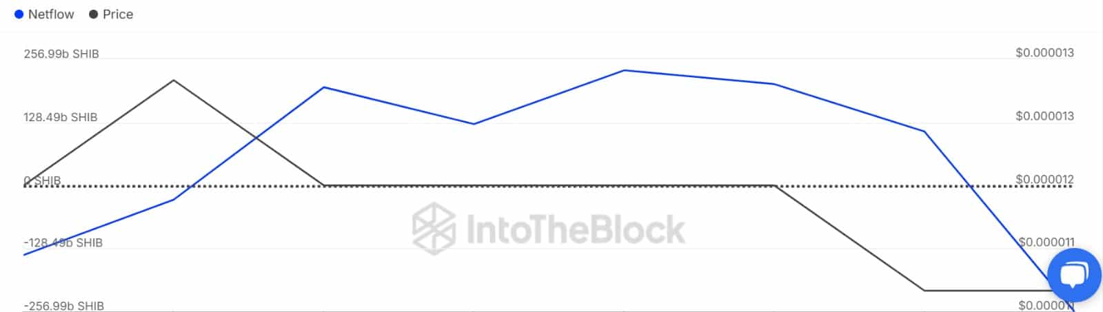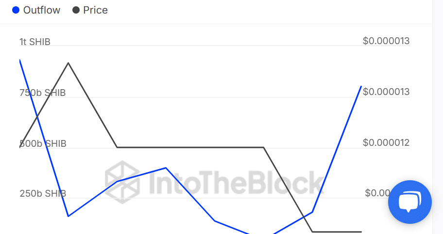 According to IntoTheBlock, Shiba Inu whales have sold 801.04 billion tokens, an increase from 180.76 billion the previous day. This marked a 343.18% increase in large holder’s outflows.