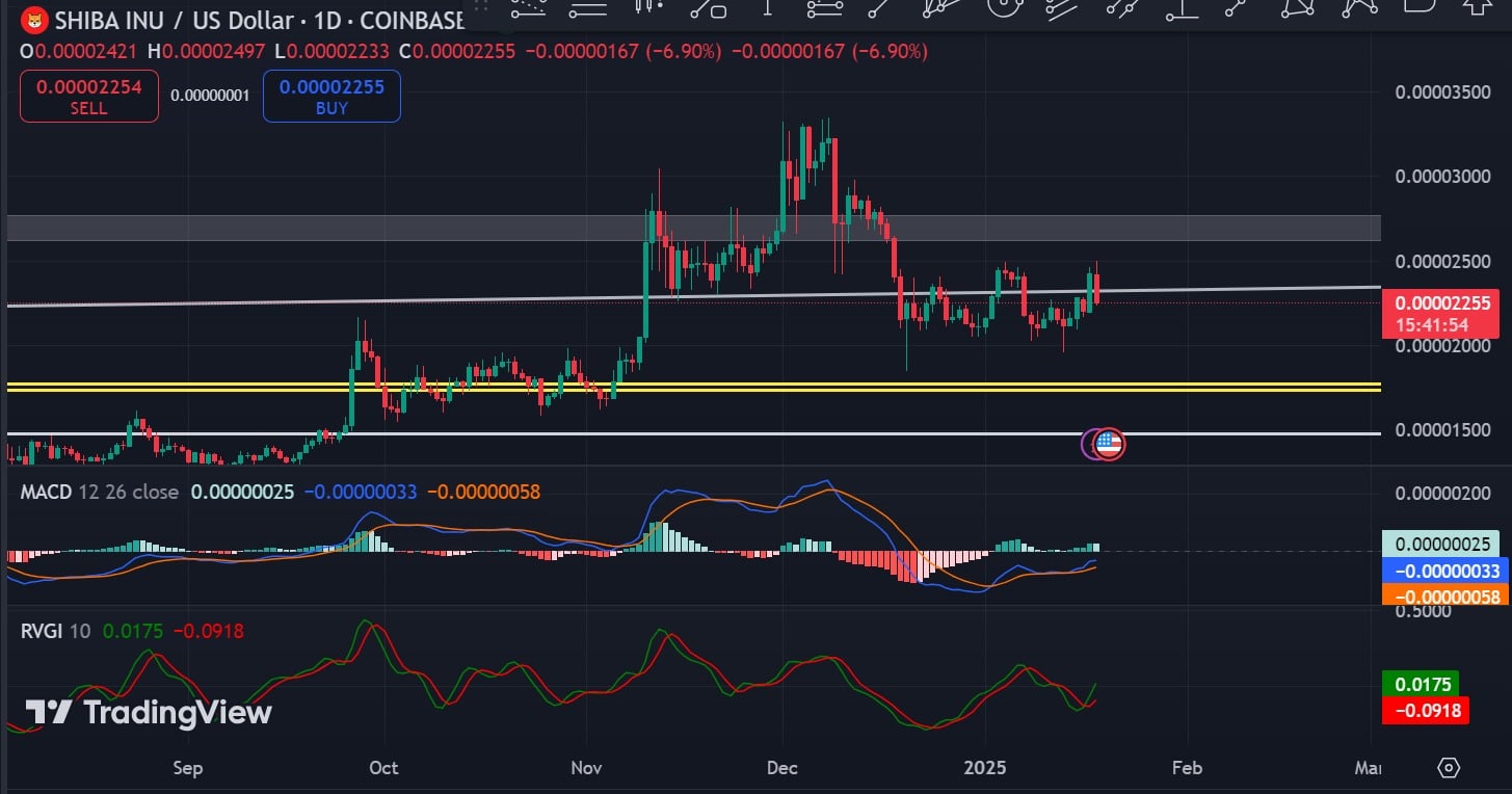 The last 24 hours saw Shiba Inu’s [SHIB] price attempt to break out of a downtrend. Alas, without some success. Even so, the popular memecoin hit a local high of $0.0000249, climbing from a low of $0.0000217 on the charts.