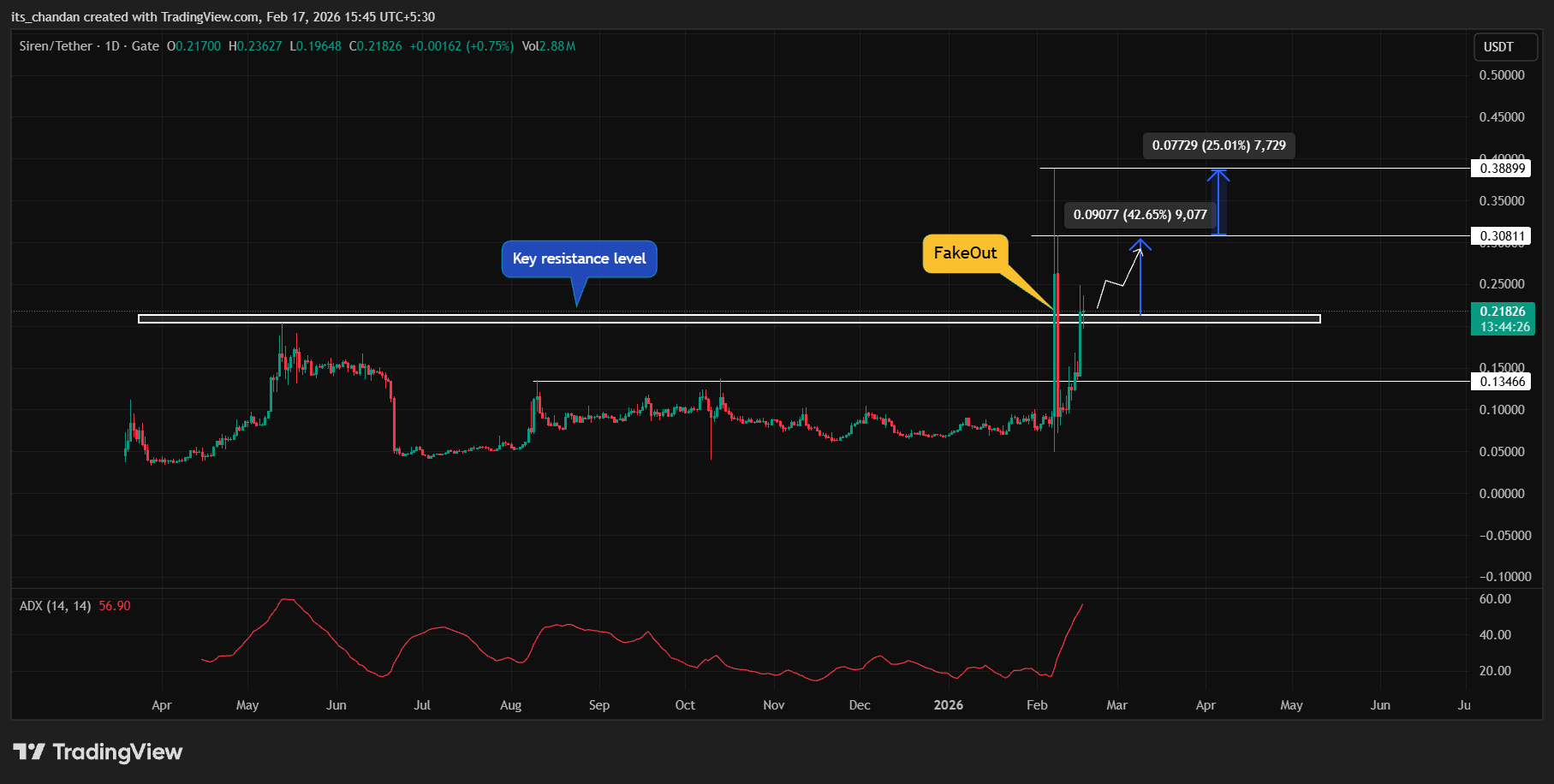 As of now, the technical indicator Average Directional Index (ADX), which measures trend strength, has reached 56.90—well above the key threshold of 25—indicating that SIREN is in a strong directional trend.
