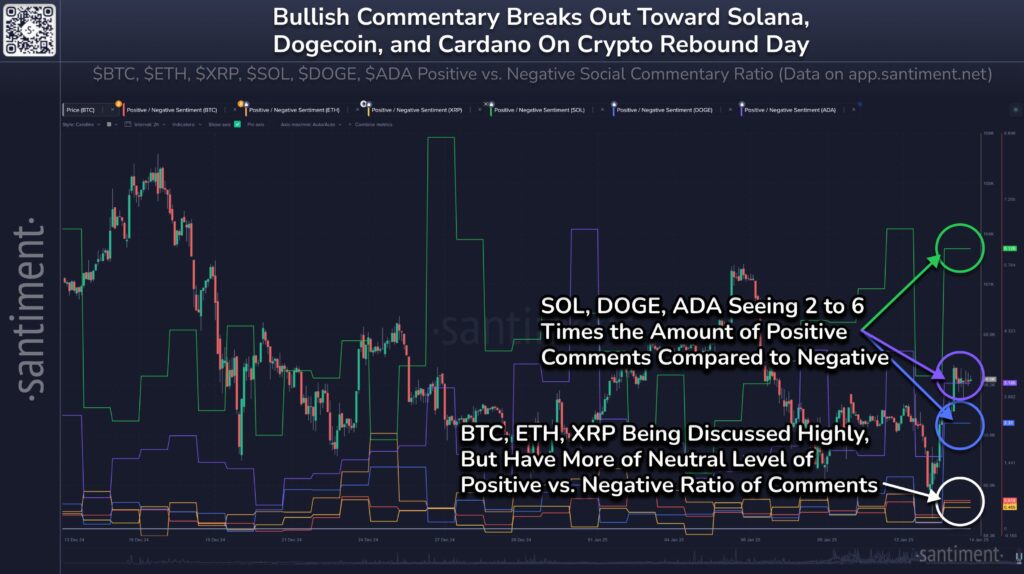 Data shows the social media sentiment around Dogecoin and Solana has seen a significant improvement following the market turnaround.