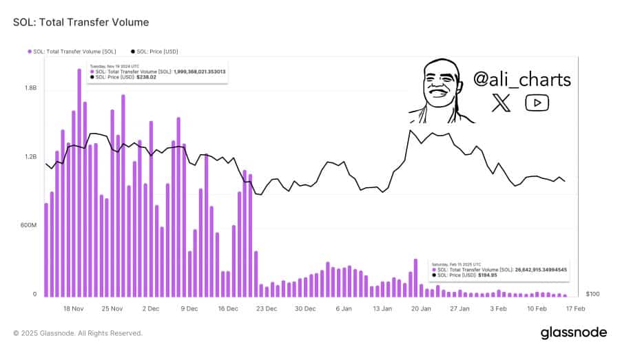 At the time of writing, reports showed that SOL’s total transfer volume, after peaking at $2 billion in November, has plunged to $26 million.