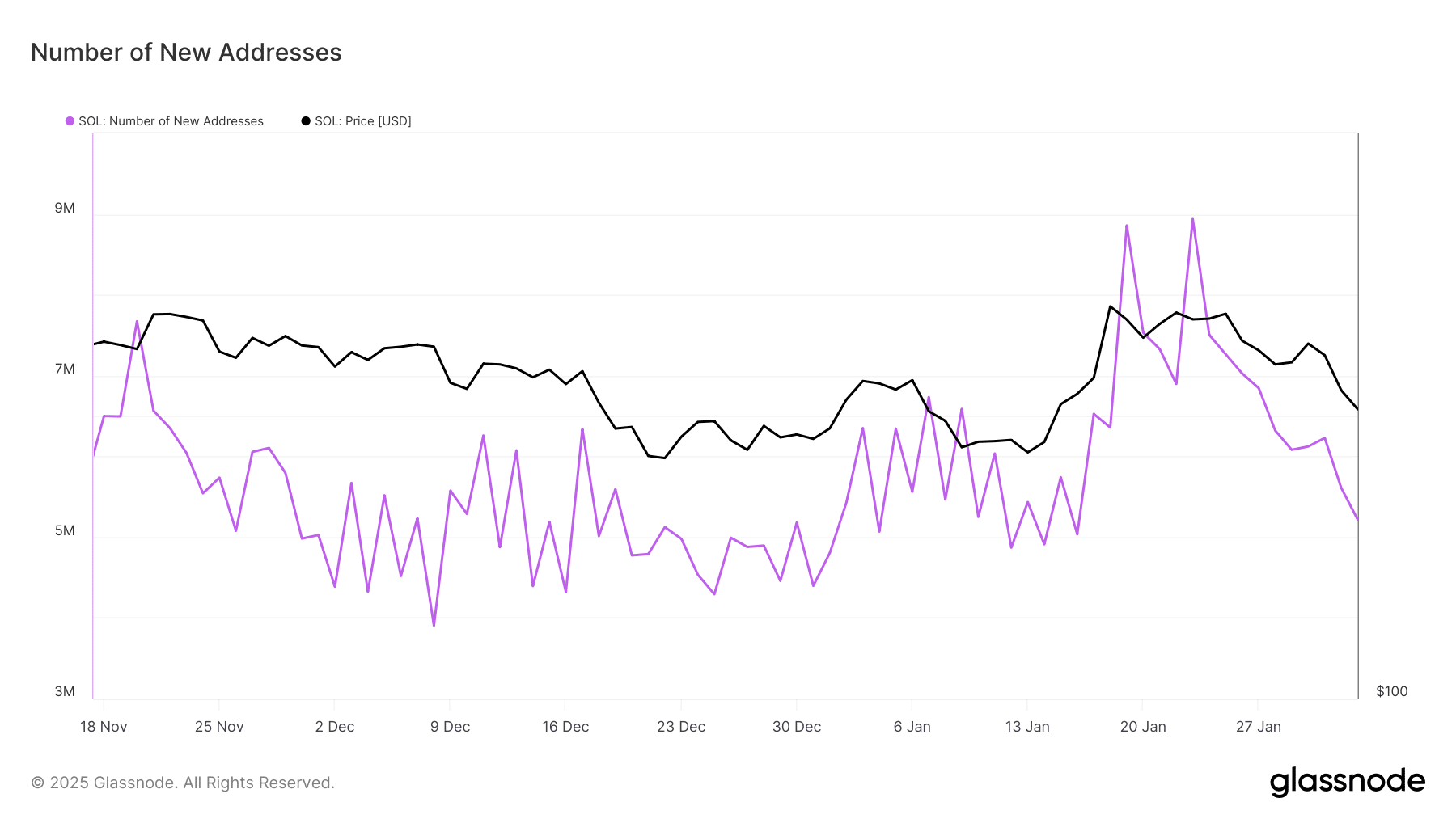 A deeper look at on-chain data from Glassnode reveals a decline in new Solana addresses, which correlates with the recent pullback in price.