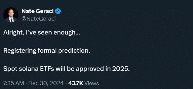 Recently, Nate Geraci, president of the ETF Store, posted on X (formerly Twitter) that spot Solana ETFs are expected to be approved in 2025.