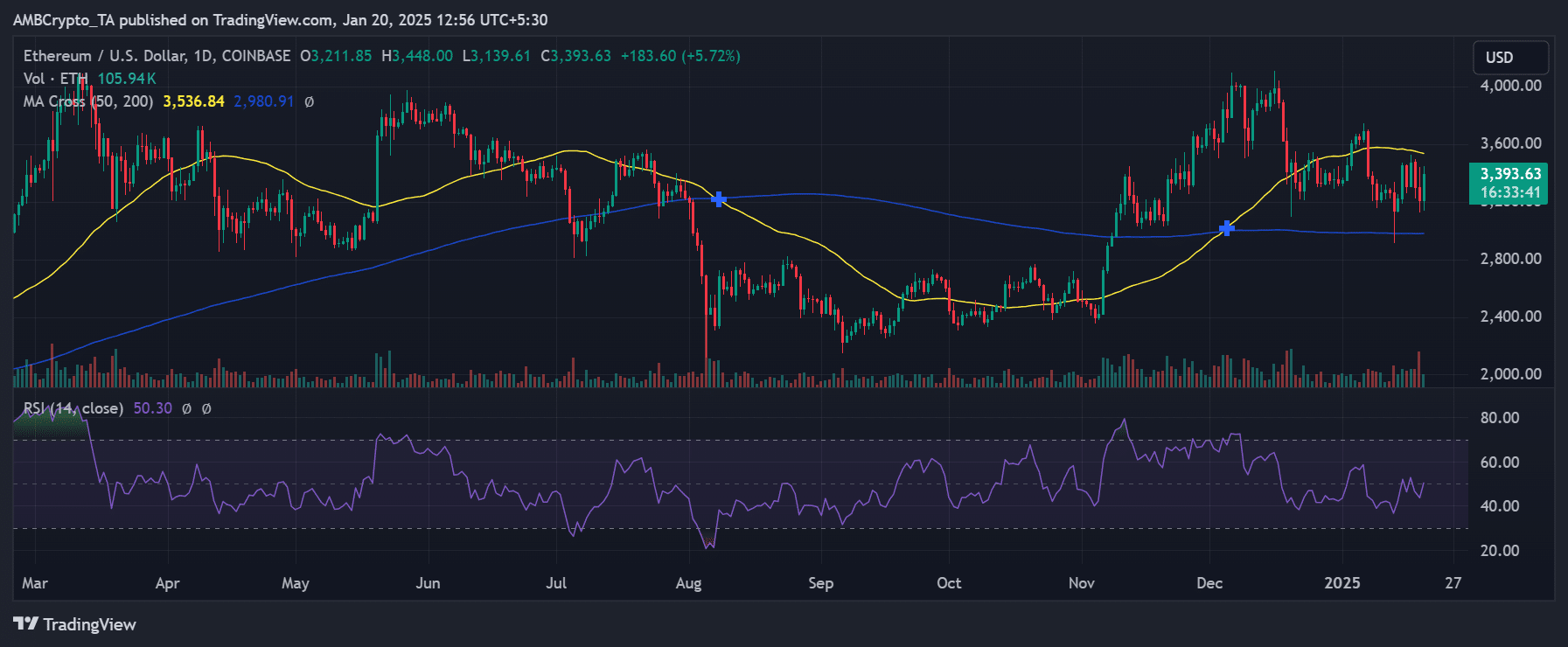 Meanwhile, Ethereum traded at $3,393.63, supported by its 50-day MA at 3,536.84. With a market capitalization exceeding $411.3 billion, ETH maintained a significant lead over Solana’s current $126 billion valuation.