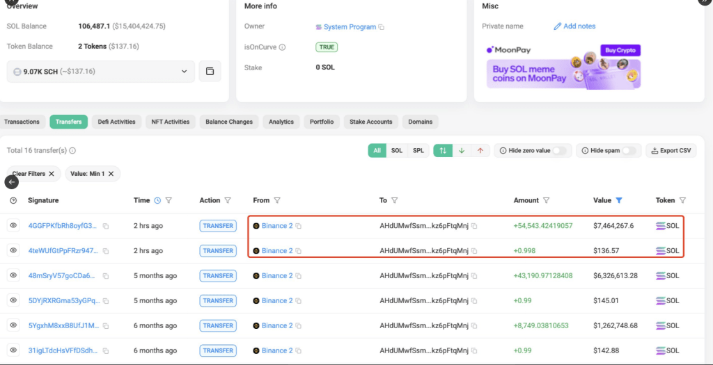 AHdUMw…qMnj withdrew 54,544 $SOL($7.46M) from #Binance 2 hours ago.