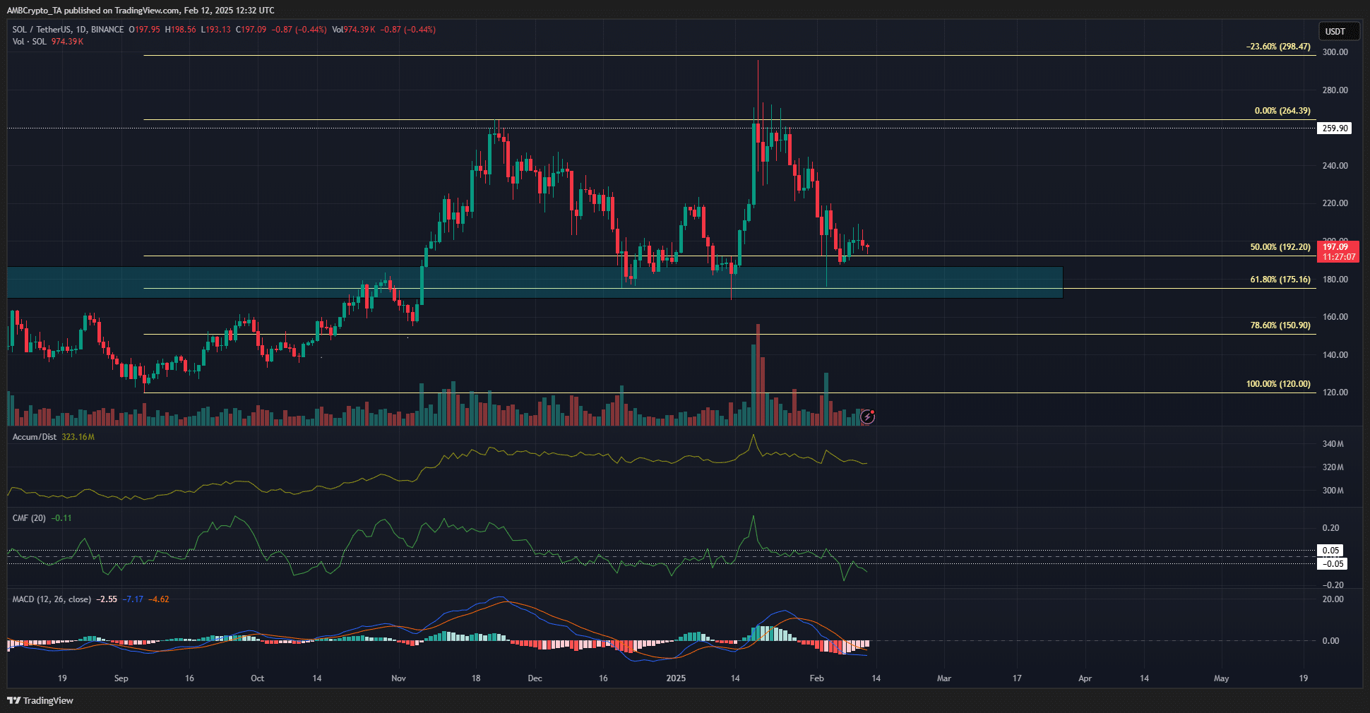Solana [SOL], at the time of writing, was met with resistance around the $205-zone once again, a short-term resistance zone that has been in place for a week. In fact, the daily chart revealed high volatility for Solana after strong gains towards the end of 2024.