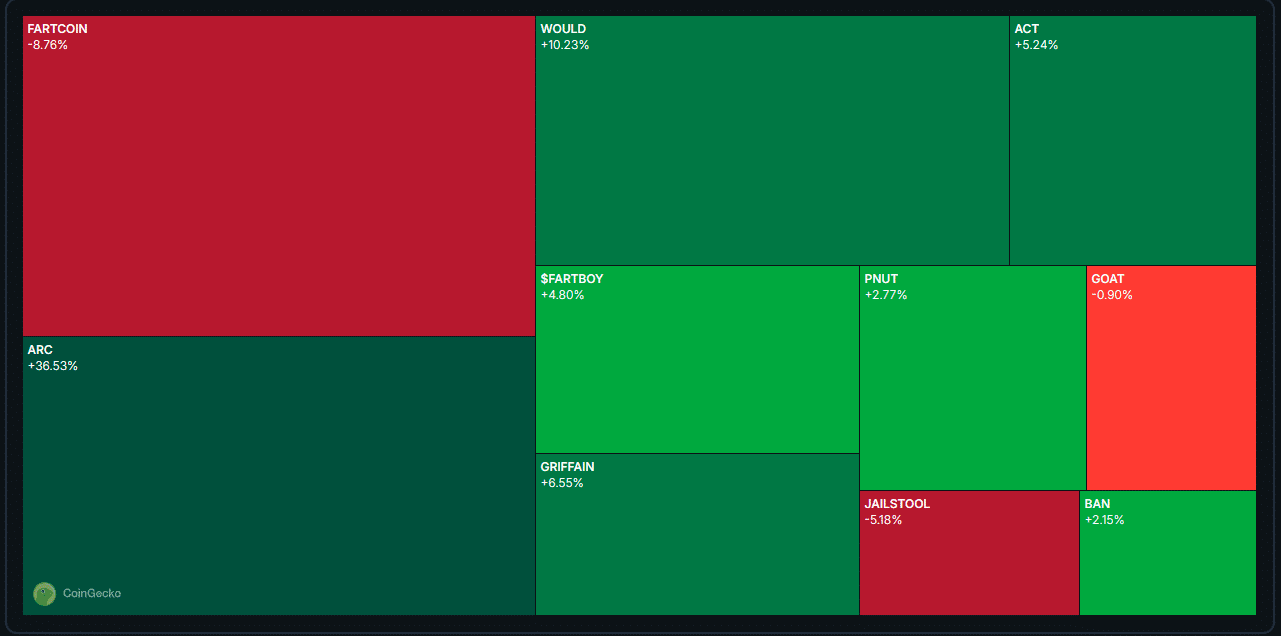 Fartcoin topped the chart, while AI Rig Complex (ARC) came in second. Other AI tokens like Griffain and ACT were within the top 10 Pump.fun tokens by market cap.