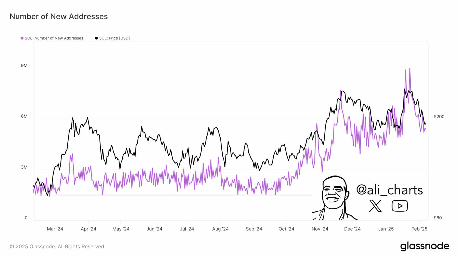 - The Solana network is expanding at a strong pace, with over 5 million new addresses created per day.