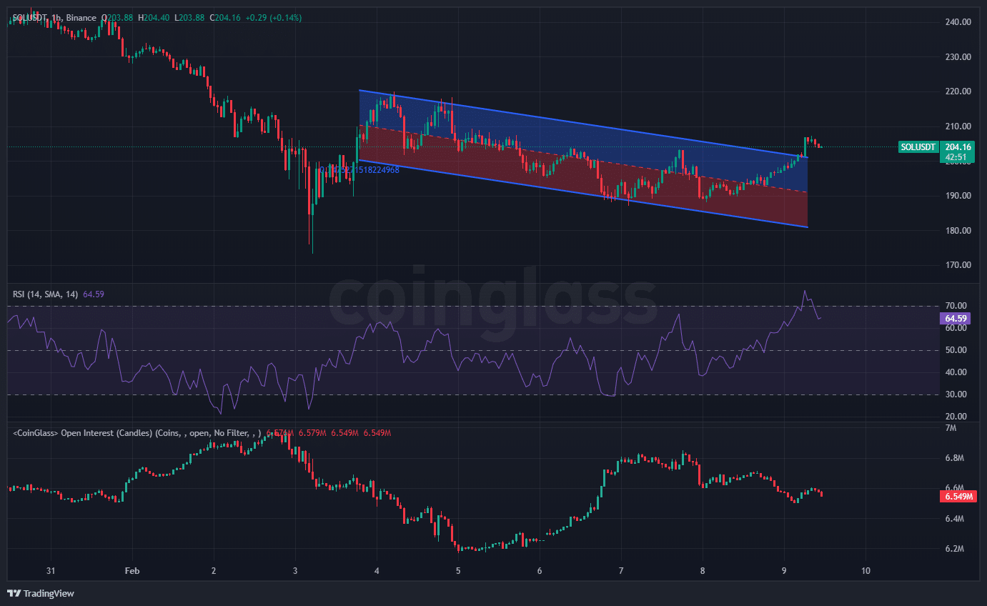 The chart indicated that SOL broke through the upper trendline, reflecting a clear upward movement. The RSI was at 64.59 at press time, approaching overbought territory.