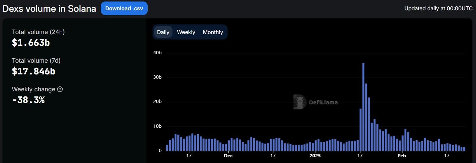 Solana’s DEX volume has experienced a significant downturn, with a 38% decrease in the last week.