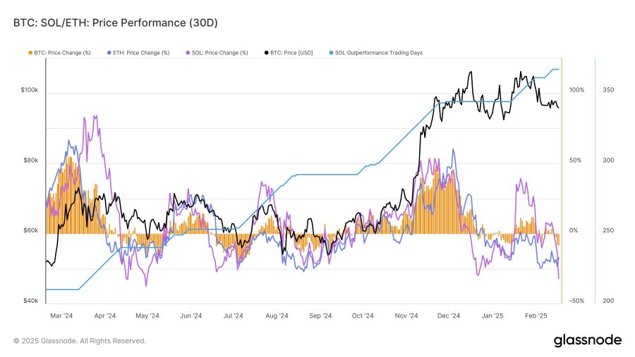 Notably, the number of days in which Solana outperformed Ethereum has plateaued, suggesting that its relative strength may be fading.