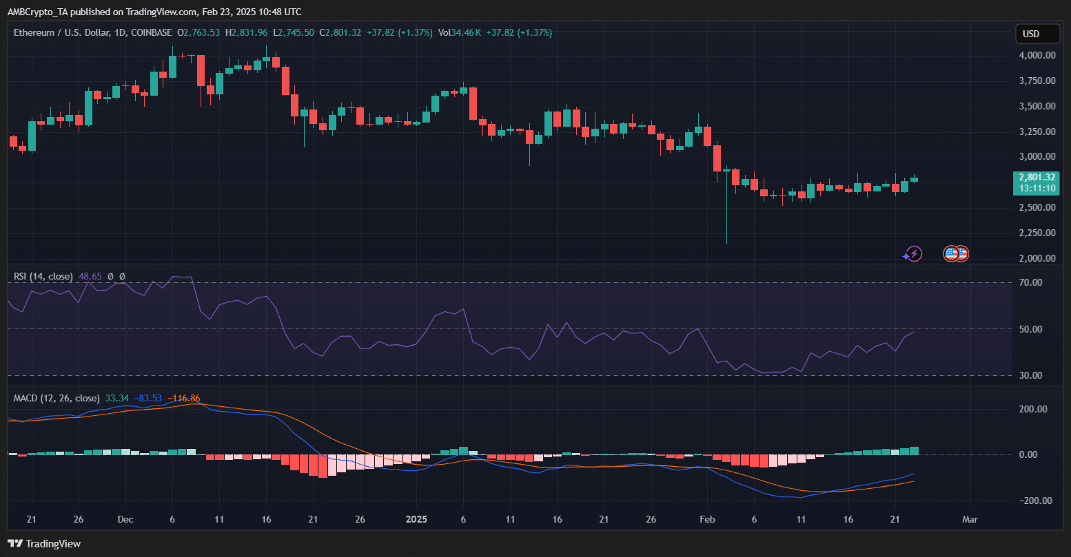 Ethereum was trading at $2,801.32, up 1.37% on the day, as it attempted to recover from recent lows