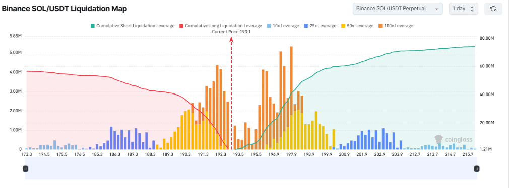 Further analysis highlighted SOL’s liquidation map on Binance, with a noticeable spike in long liquidations near the current price level of $193.