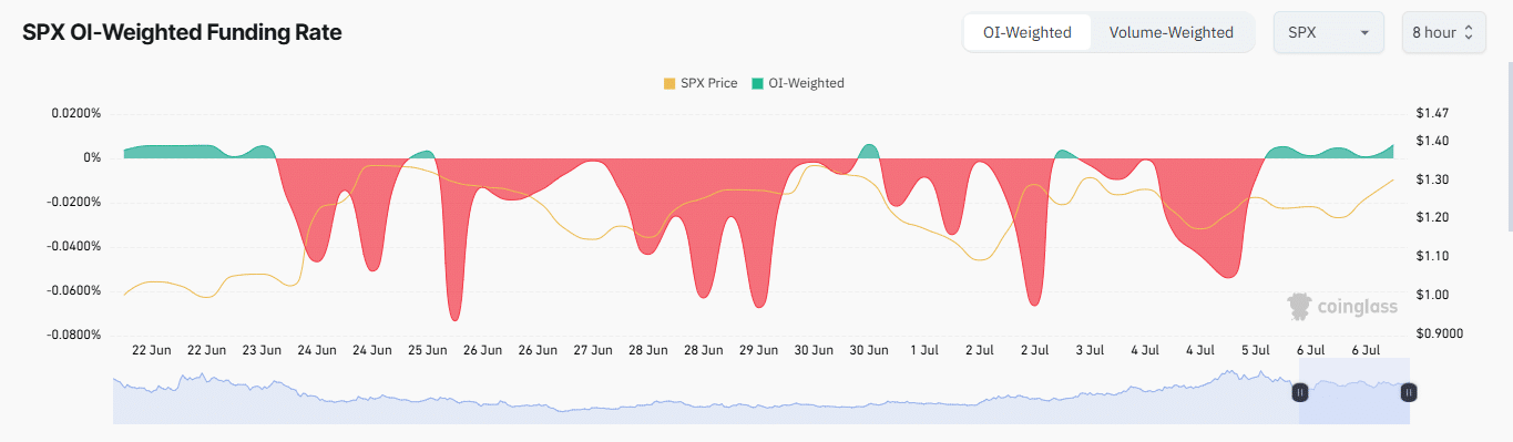 As of this writing, CoinGlass showed SPX’s Open Interest Weighted Funding Rate at 0.0076%, a level firmly in positive territory.