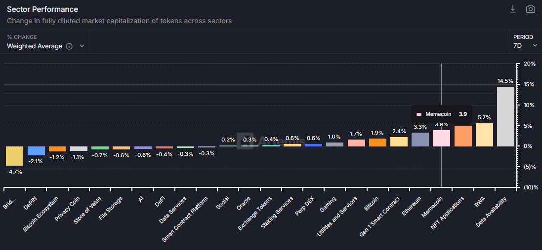 Per Artemis, memecoins have been the top-performing crypto asset class, with a 3.9% gain placing them at the top of the sector leaderboard. Tokens like FLOKI and Dogecoin [DOGE] have notably benefited from this surge.