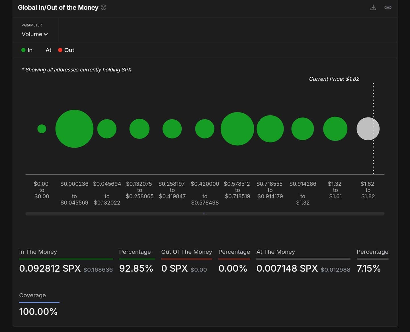 Using a concentration of accumulation addresses showed the two most significant supports were between the $0.57-$0.72 and $0.00024-$0.05 where 2,140 and 1,790 addresses bought SPX.