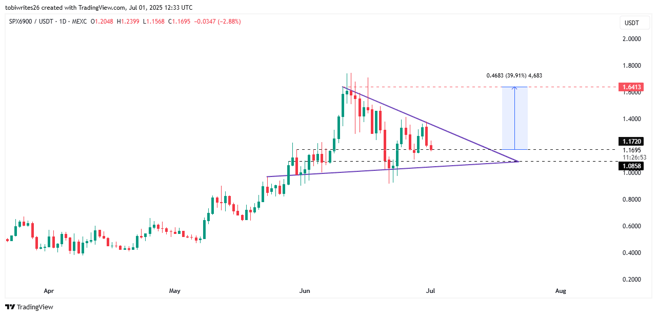 The memecoin was at $1.1720, and a breakout from this pattern could trigger a 27% rally toward $1.6413, the upper boundary of the triangle.