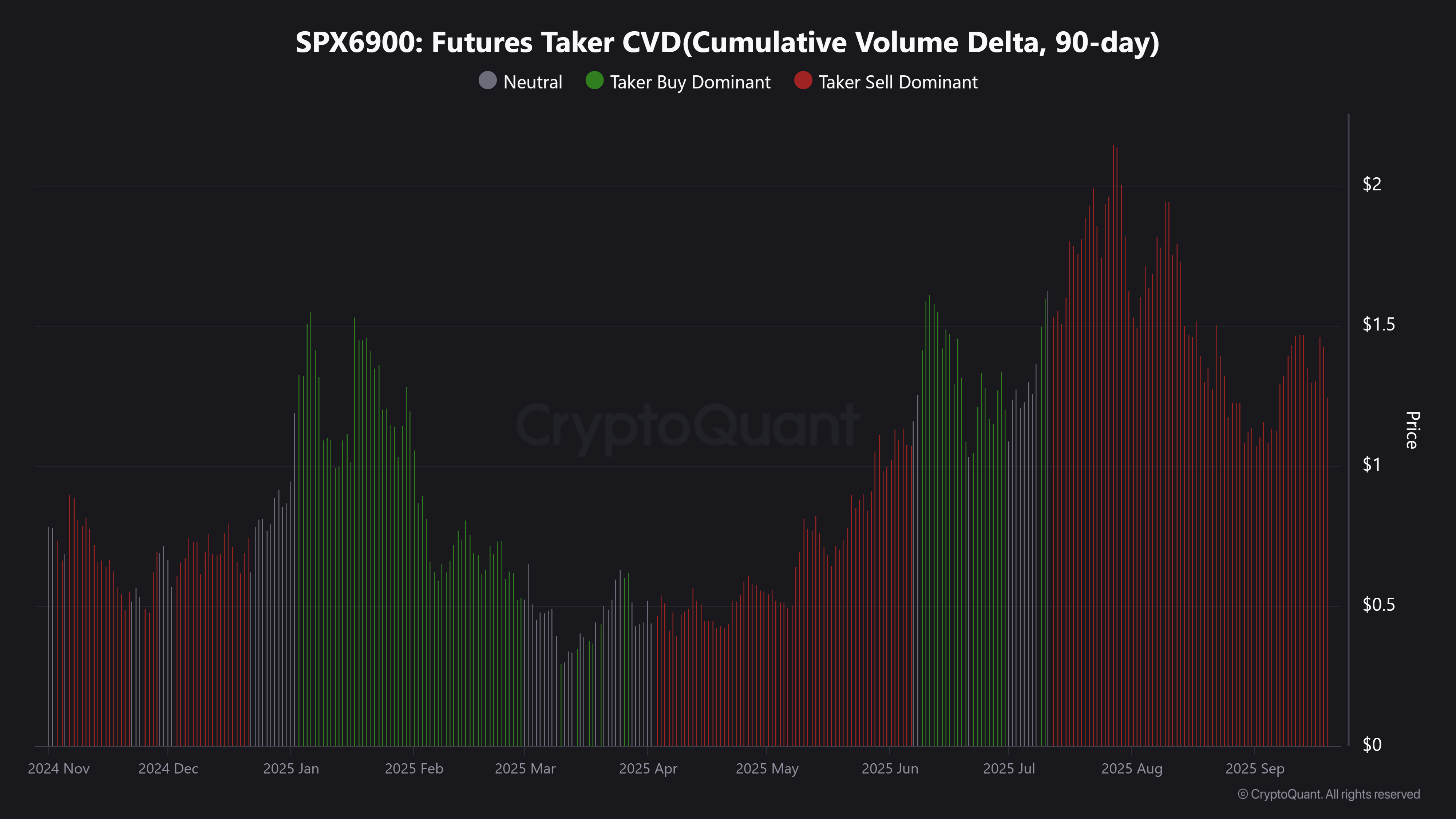CryptoQuant’s Futures Taker Cumulative Volume Delta showed sellers remained dominant in the derivatives market, pressing against rallies.