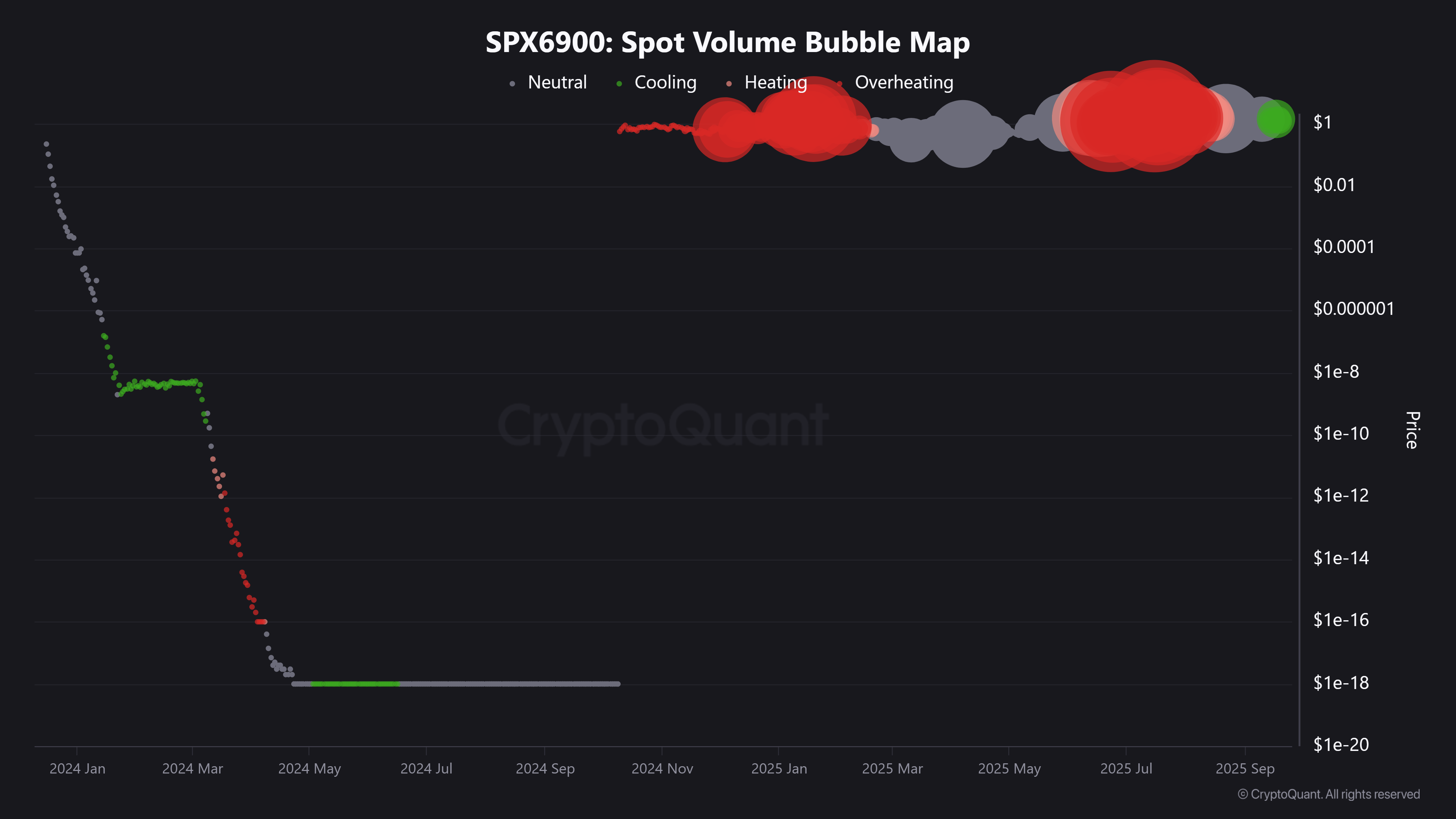 The Spot Volume Bubble Map highlighted muted demand, with recent clusters in the “heating” zone around $1.20–$1.35, but without follow-through from buyers.