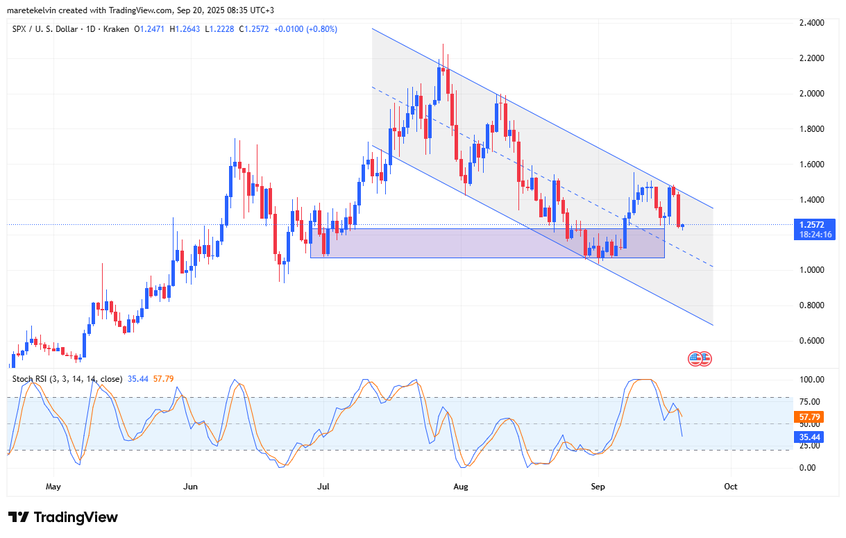 At press time, the setup pointed to a possible retest of the flag’s lower support zone between $1.18 and $1.20. Holding this level could be crucial for SPX to maintain its broader bullish outlook.