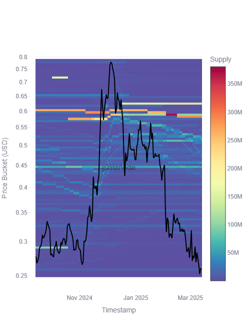 - MANA – The price has steadily declined on the charts, dropping from around $8.50 in late 2024 to approximately $3 by March 2025. The cost basis clusters indicated that a major portion of supply remains concentrated between $6.50 and $8.00, potentially acting as a resistance zone.