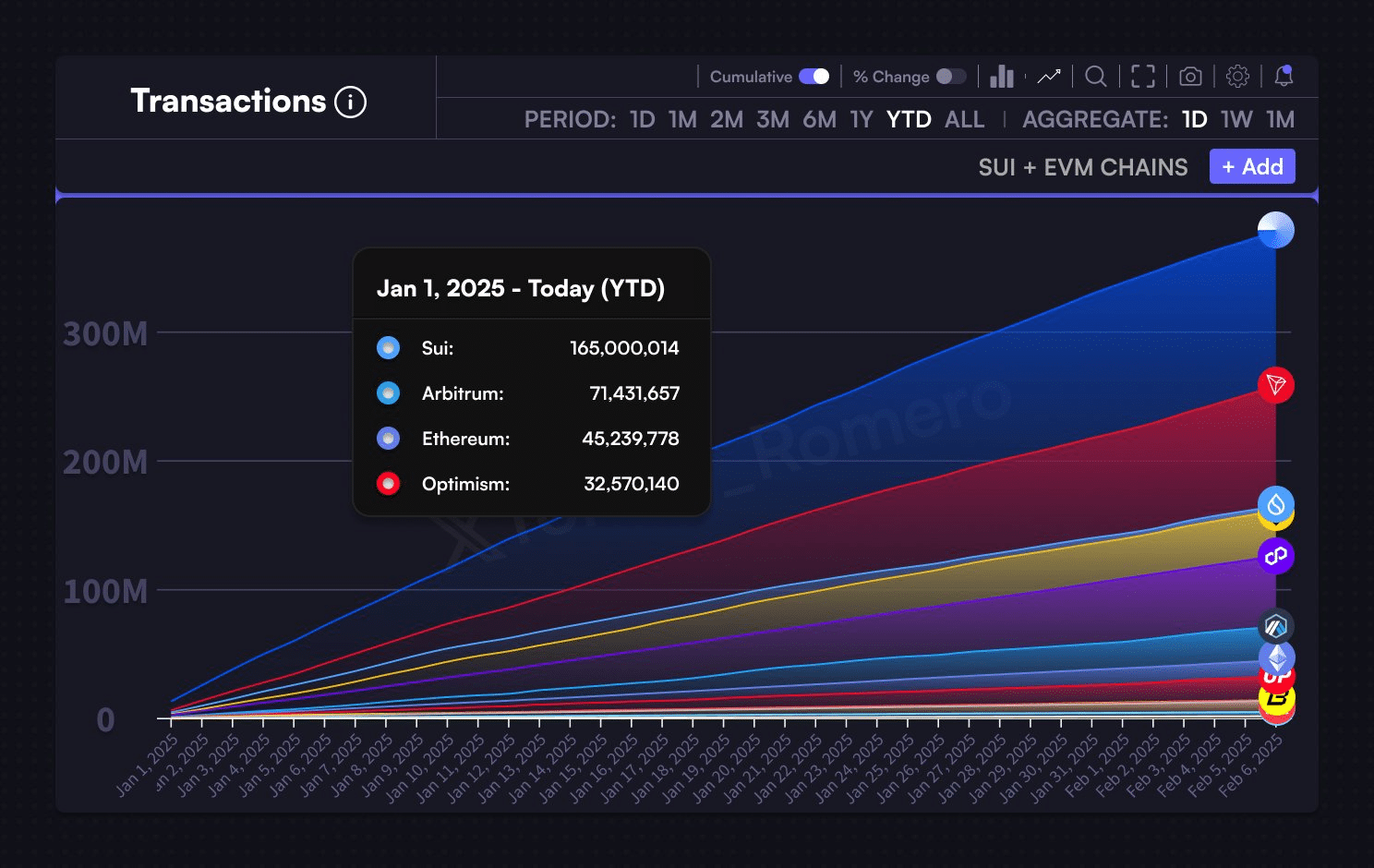 He noted that Sui is experiencing higher transaction volume than Ethereum, Arbitrum, and Optimism combined in 2025, with daily transaction volumes growing steadily.