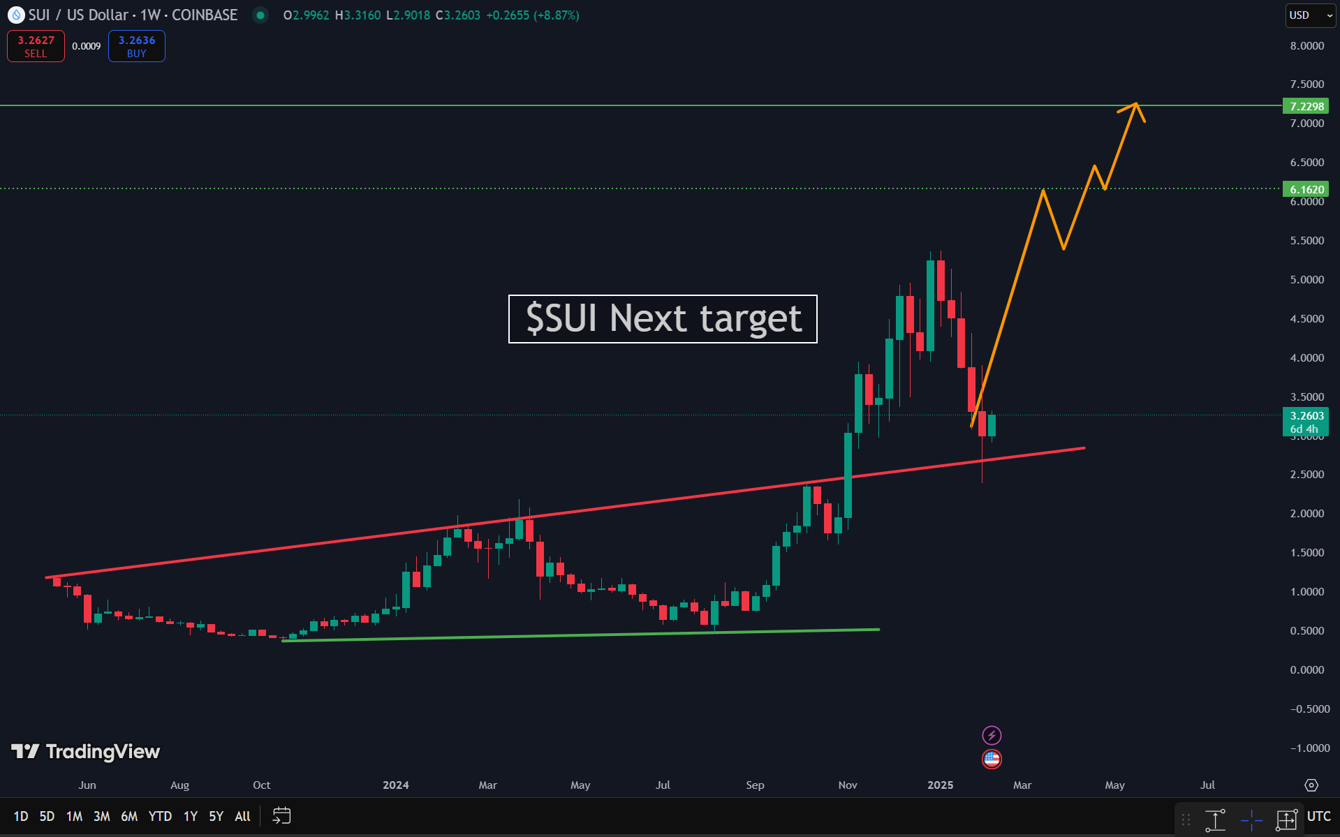 The coin could keep the uptrend after holding the $2.85 key support level. The bullish momentum could be eyeing the $6.12 critical level. If this holds, we could see SUI at the $7.00 and 7.22 resistance zone.