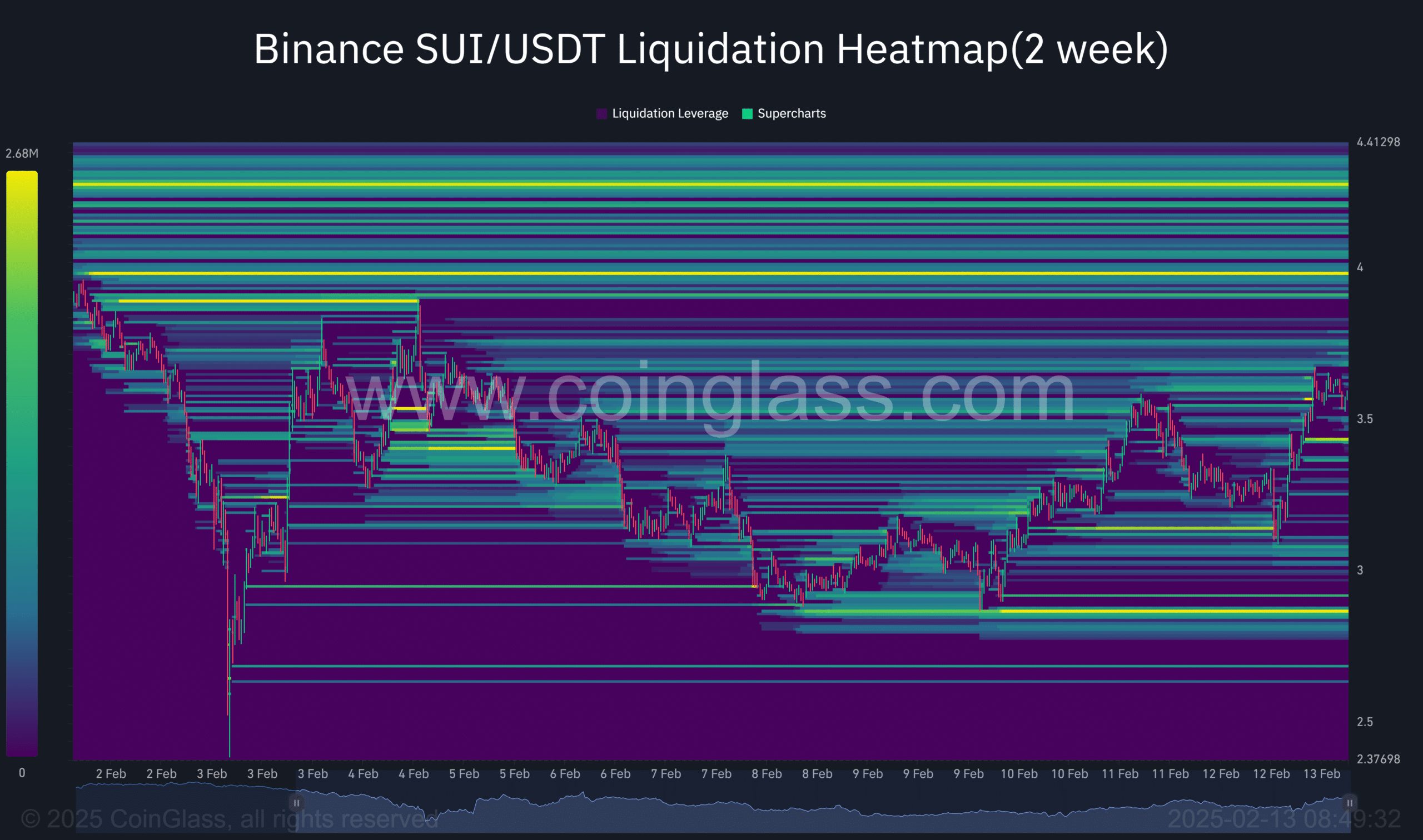 Market makers typically hunt for liquidity and influence price action. A similar scenario was evident with SUI, as seen by the price action tapping yellow levels (high liquidation zones).