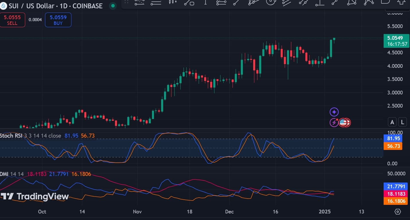 - SUI surged by by 17.85% to hit a new all-time high of $5.03