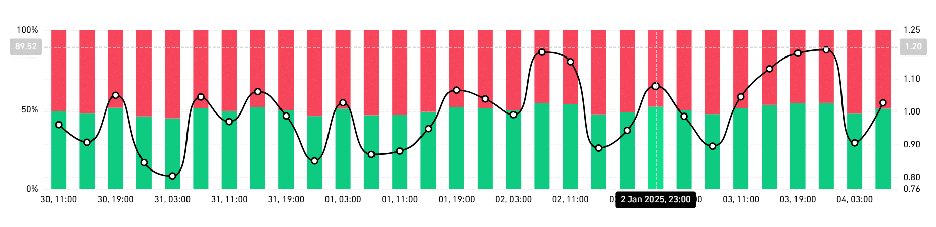 On the 4-hour timeframe, for instance, 51% of investors are taking long positions. When more traders go long, it implies they are bullish and anticipate further gains.