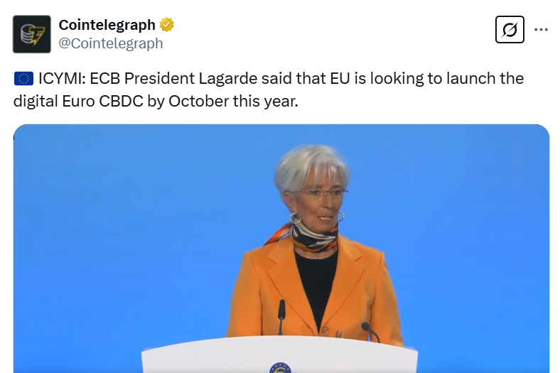 “The European Union is looking to launch the digital euro, our central bank digital currency, by October this year,” Lagarde said during a news conference, adding: