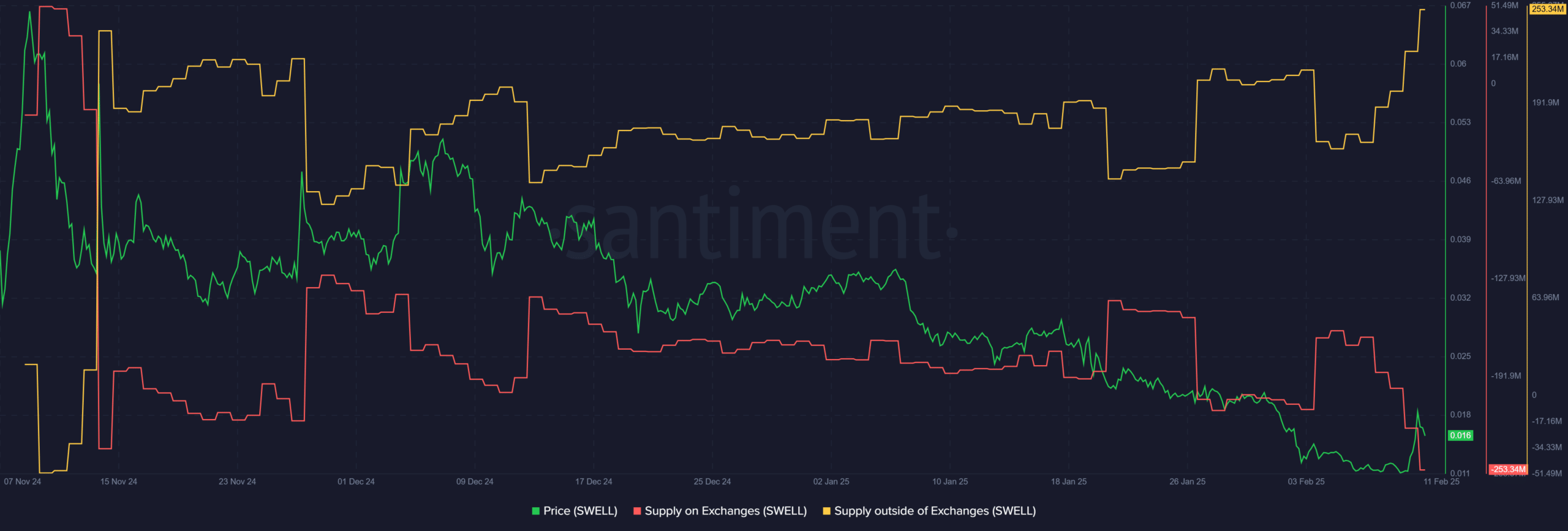 Interestingly, the coin saw steady accumulation even as the token declined by 80%. Over the past two months, over 100 million SWELL have been moved from exchanges. The Supply outside Exchanges (yellow) growth underscored this.