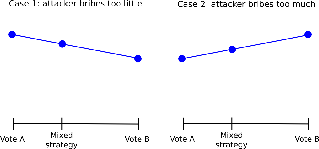 However, this approach itself suffers from the flaw that, if the attacker’s bribe is high enough, even from there one can defect. The fundamental problem is that given a probabilistic mixed strategy between A and B, for each the return always changes (almost) linearly with the probability parameter. Hence, if, for the individual, it makes more sense to vote for B than for A, it will also make more sense to vote with probability 0.51 for B than with probability 0.49 for B, and voting with probability 1 for B will work even better.