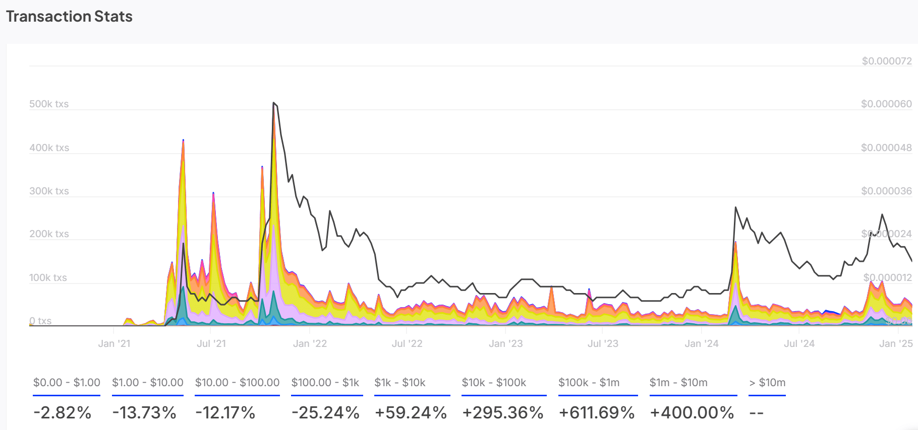 - Large transactions surged 611.69%, but declining retail activity raises concerns about long-term momentum.
