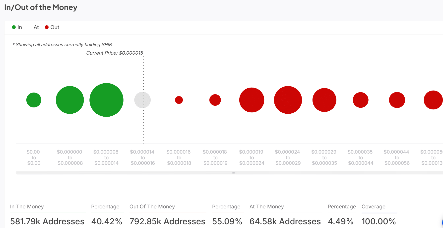 Currently, 40.42% of SHIB holders are “In the Money,” meaning they are holding at a profit. Meanwhile, 55.09% remain “Out of the Money,” indicating they purchased at higher prices and are still in losses.