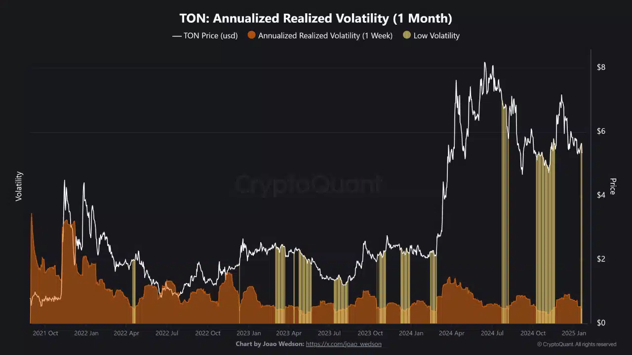 - TON’s 7-day and 30-day realized volatility have hit unprecedented lows, marking a rare calm.