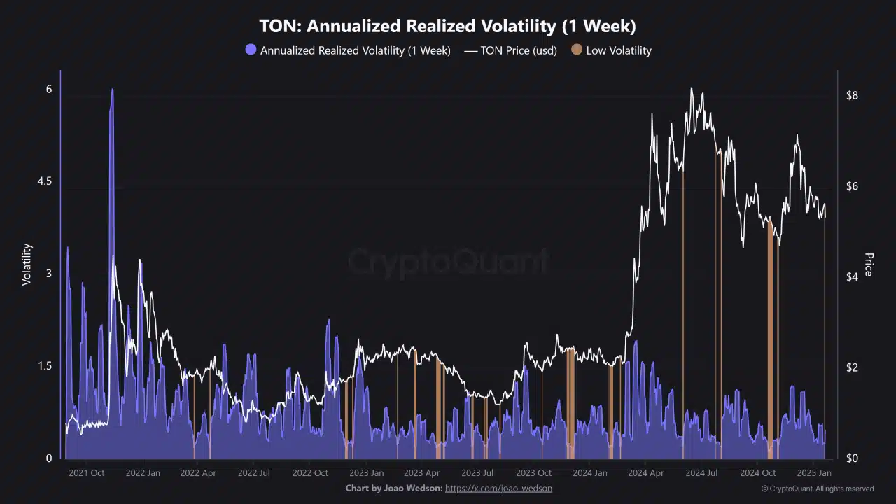 Examining TON’s history, periods of low volatility have frequently preceded sharp price changes. In mid-2022, after a prolonged low-volatility phase, TON’s price surged from $1.30 to over $2.00 within weeks—a 50% increase.