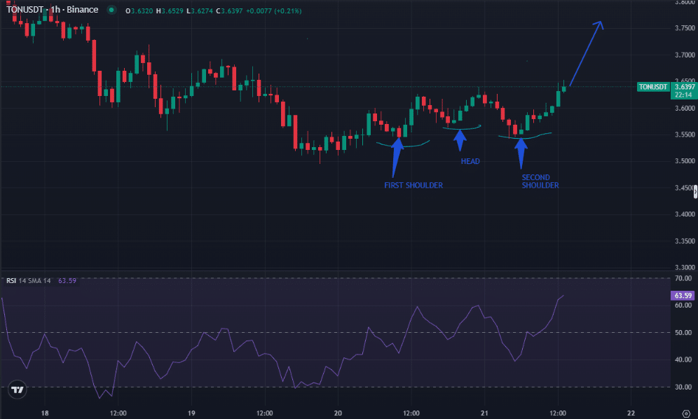 TON’s 1-hour Binance chart displays a head and shoulders inverse pattern, a historically bullish reversal signal.