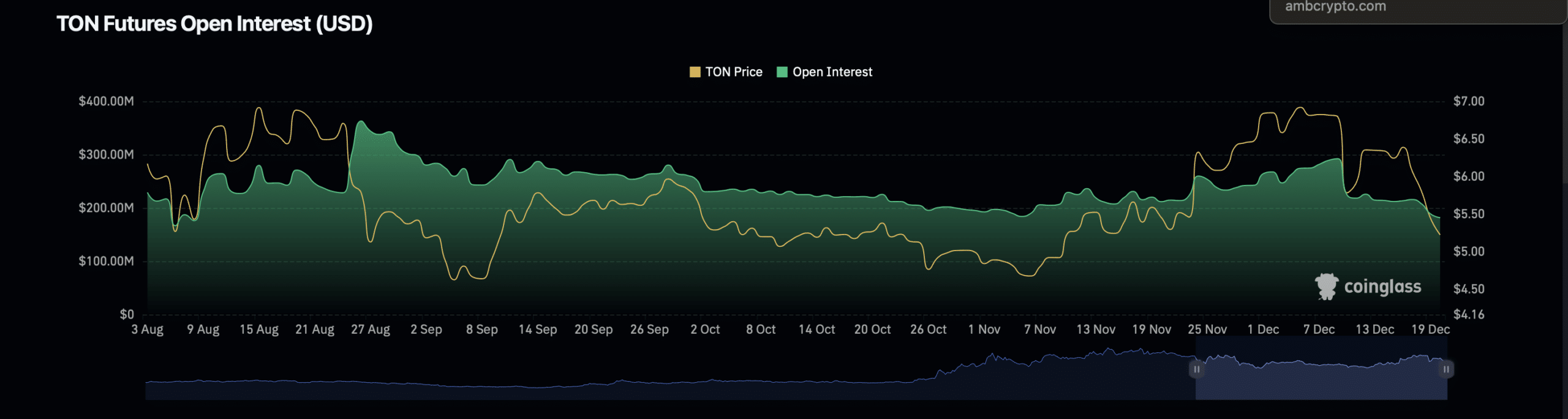 At the time of writing, TON was trading at $5.23, reflecting a 36.3% decrease from its ATH and a 24% drop over the past two weeks. This downward trend highlights the volatility in the crypto market, even for assets with a strong track record.