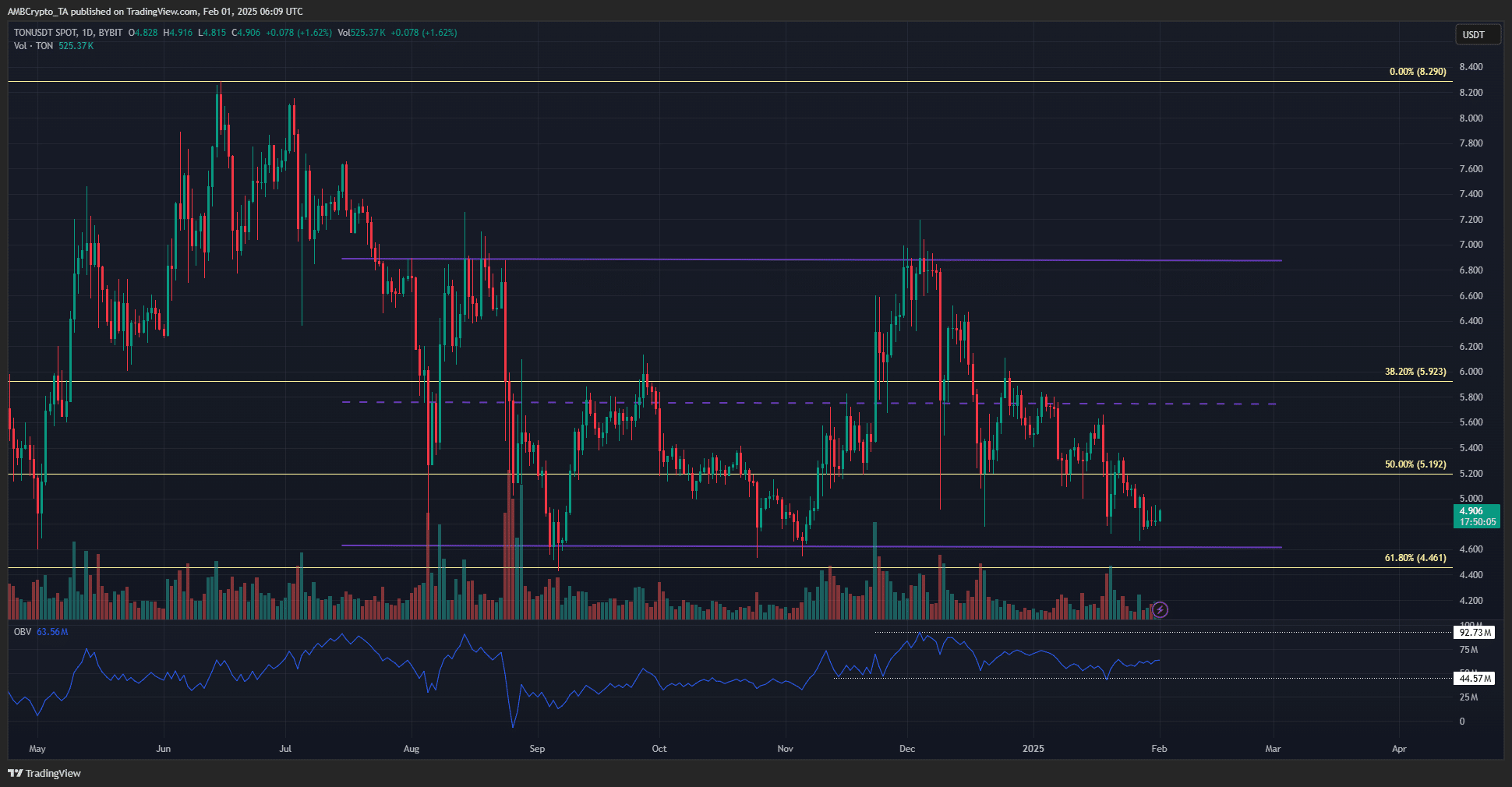 The 1-day price action chart revealed that Toncoin might be near its six-month range lows at $4.62. These lows were just above the 61.8% Fibonacci retracement level, plotted based on the rally that began in March 2024.